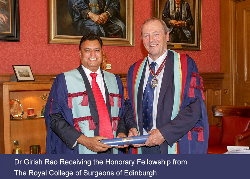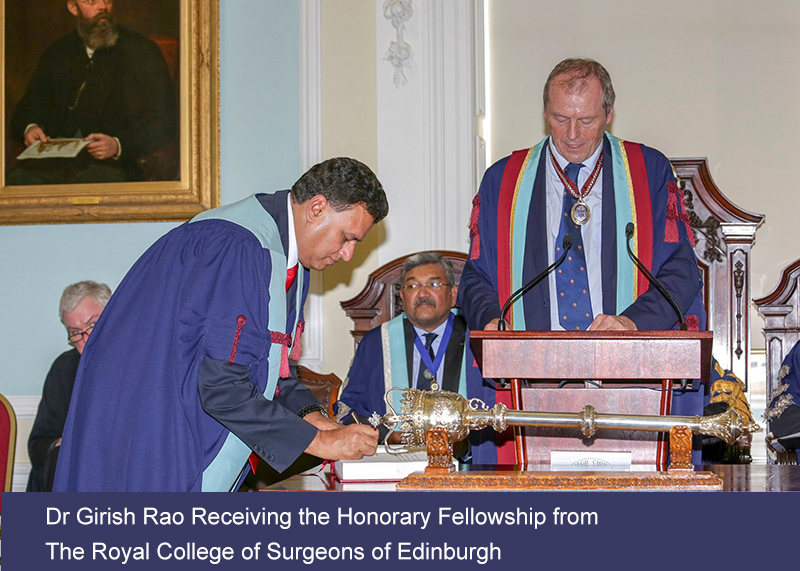 | Honorary Fellowship FDSRCS(Edin) | Royal College Of Surgeons Of Edinburgh, UK For the excellent service provided to patients by Dr Girish Rao in the field of Oral & Maxillofacial Surgery in India and also for his contribution towards Oral & Maxillofacial Surgery speciality. |
